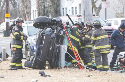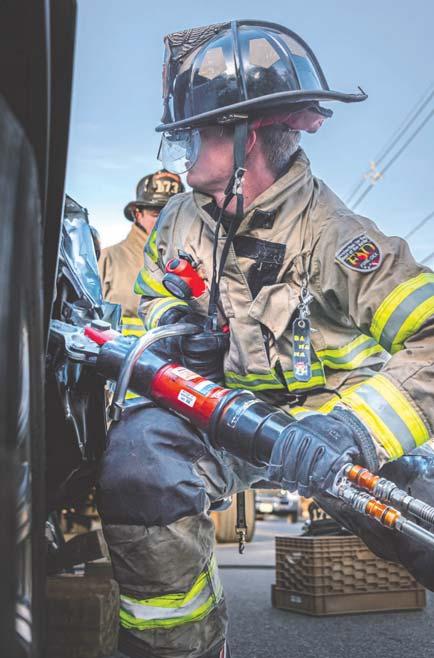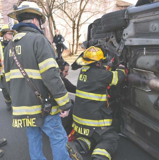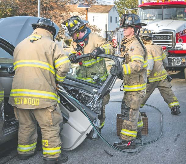 Westwood firefighters responded to an MVAwith entrapment. The Rescue 1 crew freed an uninjured front seat passengerwho had been trapped by extensive doorand fenderdamage. Engine 1’s crew stretched a handline forscene protection. Both tethered hydraulic line and battery powered tools were used. - Fire News photos by WFD/Nick Ariemma