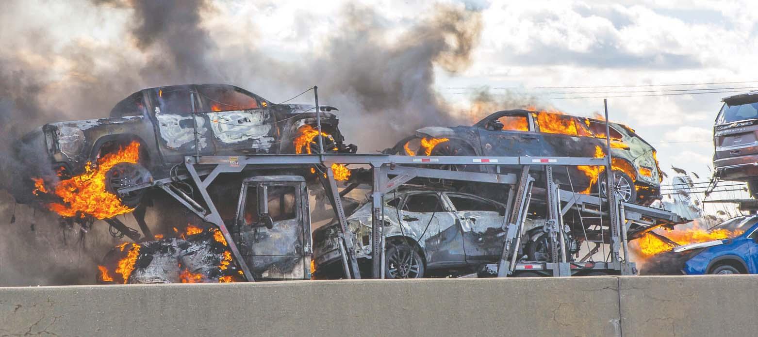 On February 4, 2025, the Carlstadt Fire Department responded to New Jersey Turnpike fora reported truck fire. Alarge column of smoke was visible and crews arrived to find a tractor-trailercarcarrierwith the cab and several vehicles on fire. Due to no hydrants available on the highway, two additional engines were requested as was a tankerfrom Ridgefield. Crews attacked the fire and the engines needed to rotate out to refill their tanks. The fire was declared undercontrol in about an hour. The trailerand fourcars were heavily damaged.