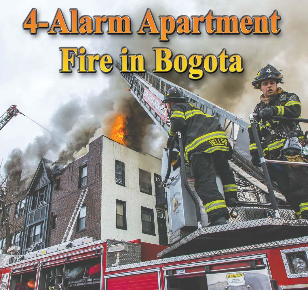 Afour-alarm fire tore through an apartment building’s top floorand cockloft on Palisades Avenue in Bogota on February 9, 2025. Crews arrived to heavy smoke and fire already in the cockloft and a second alarm was transmitted. As crews worked feverishly to open the roof and ceilings below, the fire had made significant headway across the building and a third alarm was transmitted. As conditions on the roof deteriorated, command ordered all members off and, shortly after, portions of the roof began collapsing into the top floor. Command then ordered all companies out of the building and transitioned to a defensive attack. Three ladderpipes, one deck gun and a blitz fire worked on knocking down the heavy flames. The fire was finally placed under control around fourhours later; the cause of the fire was unknown. One resident was transported to the hospital and several dozen were displaced.