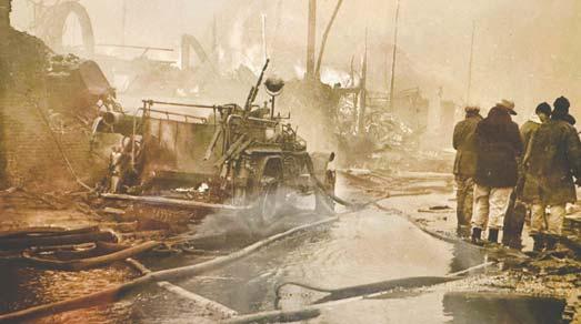 On September1, 1992 a massive fire destroyed the historic Collingswood Flea Market complex on Route 33 in Howell Township. The fire, reported late in the afternoon, took several hours to be placed undercontrol, required mutual aid companies from fourcounties and the use of tankers and tenders as well as a five-inch hose relay which stretched well overa mile due to limited hydrants in the area. It was one of the largest structure fires to hit the area in many years.