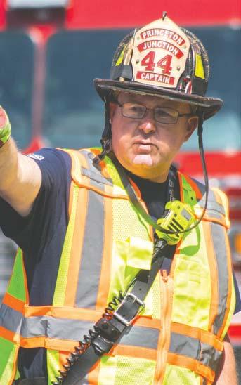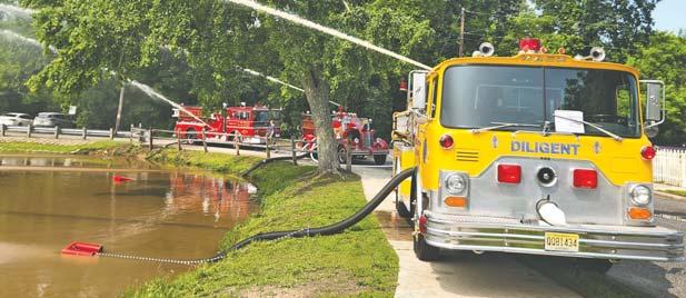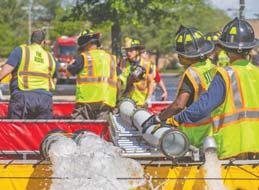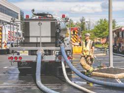 Alarge-scale watersupply drill, held in West WindsorTownship, brought togethercrews from five counties on the morning of May 18, 2025. The exercise, conducted at a corporate complex off AlexanderRoad, featured tanker/tenders shuttling waterto two separate drop tank locations to supply two aerial masterstreams and multiple 1-3/4-inch lines. Multiple tanker/tenders were able to be refilled simultaneously via several hydrants and drafting operations set up nearby. Atop flow of nearly 3000 gpm was attained at the height of operations. Joining MercerCounty firefighters were fire companies from Burlington, Middlesex, Monmouth and Ocean counties. - Fire News photos by Michael Ratcliffe