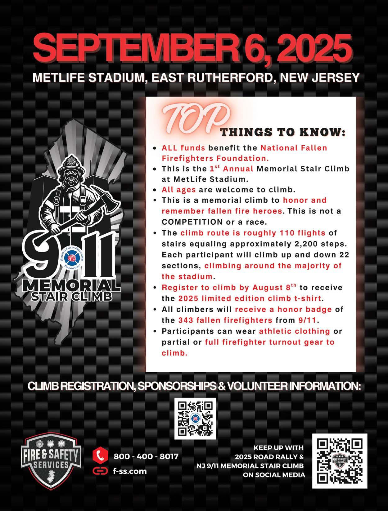 David Russell, President and Principal of Fire & Safety Services, expressed the significance of this event, stating, “The 9/11 Memorial Stair Climb is a powerful reminder of the courage and commitment of our firefighters and first responders. It’s our duty to honor their legacy, and through this event, we not only remember them but also support the families left behind.” Together, we can ensure their sacrifices are never forgotten.