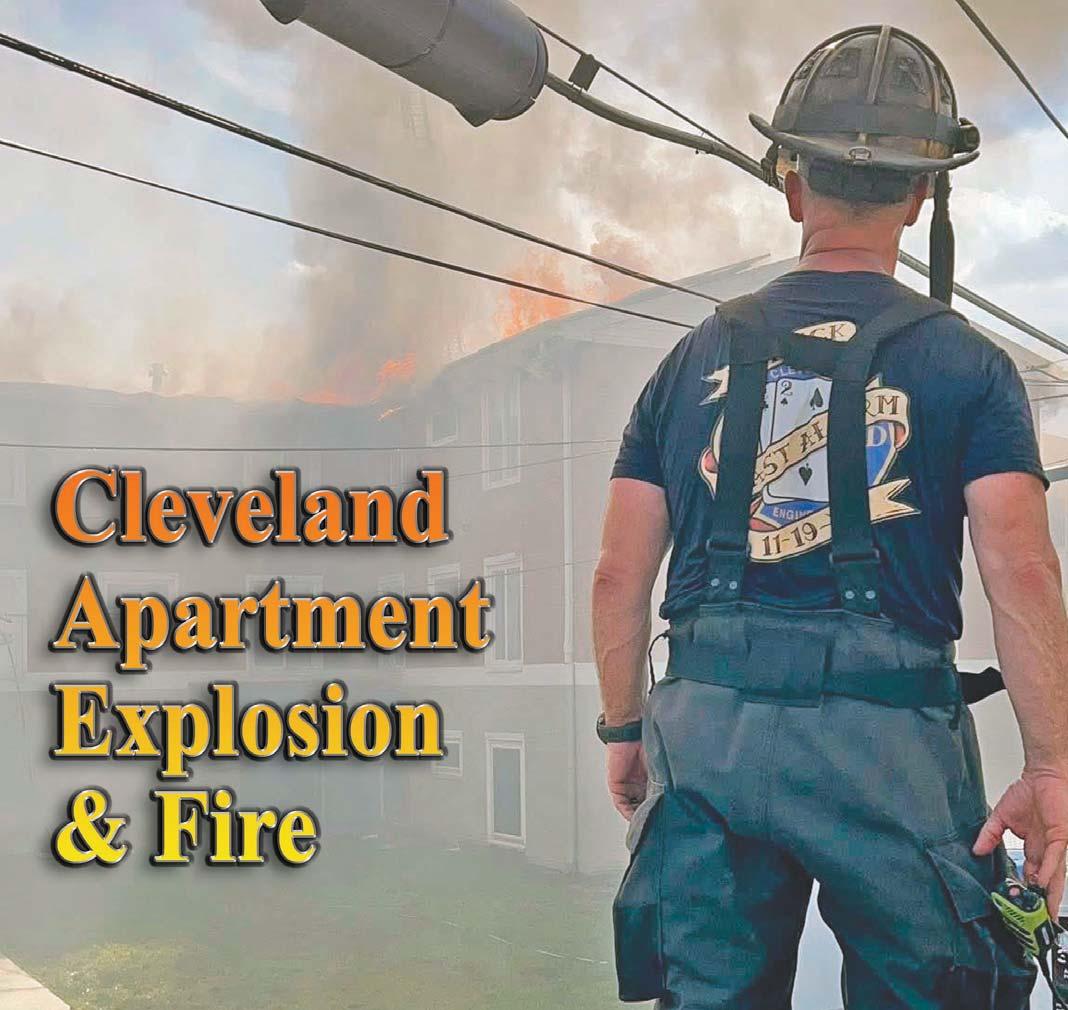 Cleveland Fire responded to a two-alarm explosion and fire in an apartment building at East 70/Garden Valley recently. Five people were transported by Cleveland EMS to MetroHealth. The extensive fire required 22 companies and over60 firefighters to respond. Engine 41 was first on scene because first-due Engine 26 was out shutting down hydrants. E41 crew rescued a trapped woman from a third-floorwindow. The woman had dropped herbaby down to