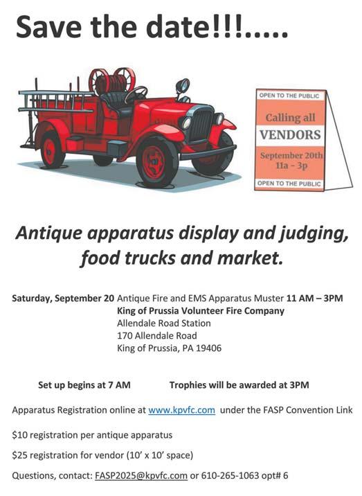 Registration is $10 per antique apparatus; and $25 registration for vendor (10' x 10' space) Questions, contact: FASP2025@kpvfc.com or 610-265-1063 opt# 6