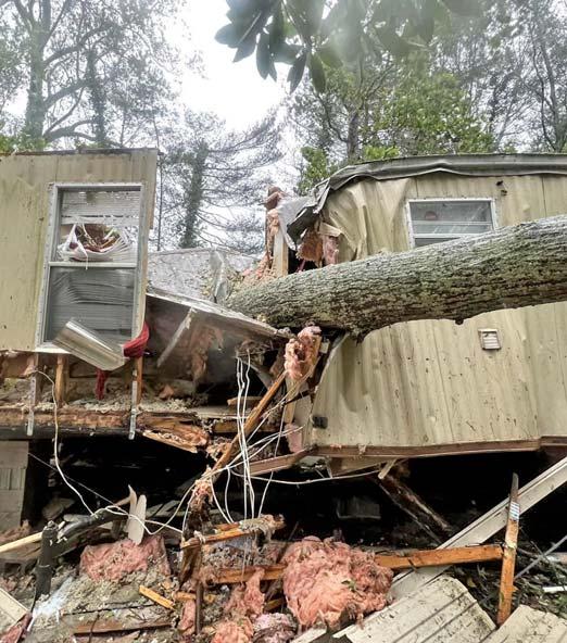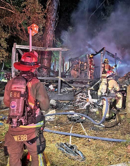 Afire heavily damaged a home in the 700 block of Mol Senia Lane in the Round O Community on October30, 2024, at 2201. While crews responded to a nearby business fire, a family discovered flames in the roof above a utility room. Two adults and three children safely evacuated. Engine 9 arrived to find the double-wide mobile home with flames through the roof, and spreading through the attic. Firefighters deployed handlines, entered through the front door, and pulled all of the ceilings in the north end to extinguish the fire. They managed to contain the blaze to the attic, but extensive smoke and waterdamage rendered the home unlivable. The presence of a metal roof overa shingle roof complicated firefighting effort, requiring removal of parts of the metal roof. Firefighters worked forfourhours to extinguish the fire, which is believed to have started from an electrical issue nearthe breaker box in the utility room. - Courtesy of Colleton County FR