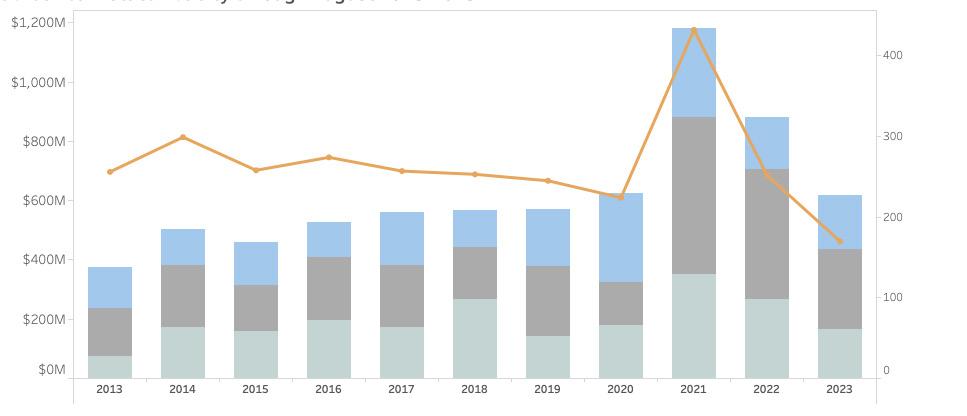 ALL PROPERTY TYPES 2023 2022 % CHANGE YOY 5-YEAR AVG. Transactions 170 252 -33% f 281 Dollar Volume ($ in 000s) $615,534 $866,948 -29% f $761,787 Months on Market 3 2.8 7% d 5.6 Sale Price to Last Ask 97% 97% 0 r 95% Active Listings 165 160 3% d 319 Projected Absorption 5 3.5 36% d 9.6 New Monthly Contracts 52 43 21% d 81 Dollar Volume # of Transactions