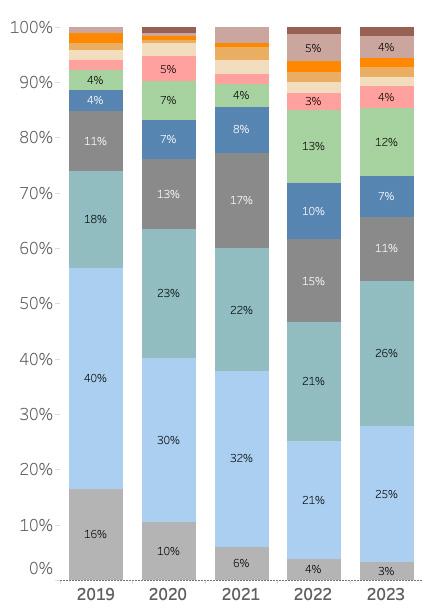 • In looking at 2023 as compared to the five-year average, it’s no surprise that the biggest decline is on the sub-$1 million price point which stood at just three percent in 2023 but was eight percent for the five-year average. The biggest increase took place between $5 million and $6 million, which represented 12 percent of market activity YTD, compared to seven percent over the last five years.