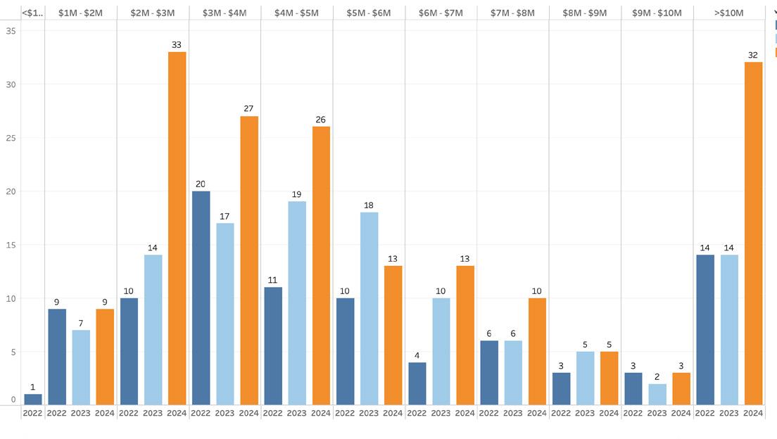 • In reviewing residential sales activity by price point, the most significant increase in transaction activity as a percentage of total activity was for singlefamily home sales between $4 million and $5 million, which rose 12 percentage points from one year ago. Sales between $3 million and $4 million increased to 14 percent of total transaction volume, while sales between $1 million and $2 million fell by 12 percentage points from one year ago. Most other price points were very similar to 2023.