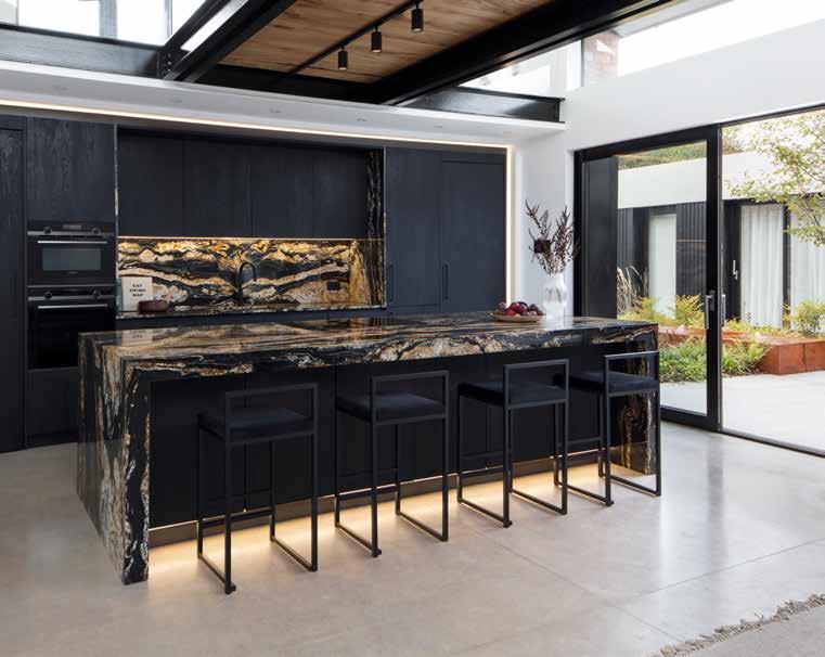 designer on the project, “This land and the reservoir itself had sentimental value to our clients, so the kitchen needed to respect this connection. To do this, we fused industrial style with natural materials to complement the architecture. We chose rich black timber cabinets to create the dramatic impact they sought and to tie in with the exposed black steel beams. The design introduces warm tones with the quartzite surfaces in homage to the original reservoir building’s heavily weathered, rusting exterior and incredible sunsets views.”