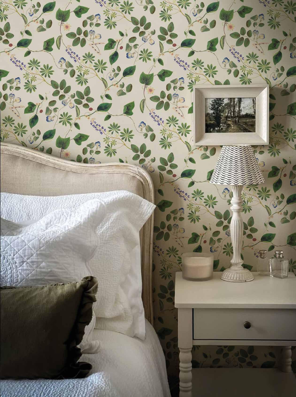 Inspired by the British countryside, w greens intertwined with delicate blue and white blossoms. Intricate vines and tendrils connect detailed leaves, sweet peas, and flowers, evoking an English botanical garden. The handpainted, organic illustration creates a nature-inspired ambiance. deusexgardenia.com