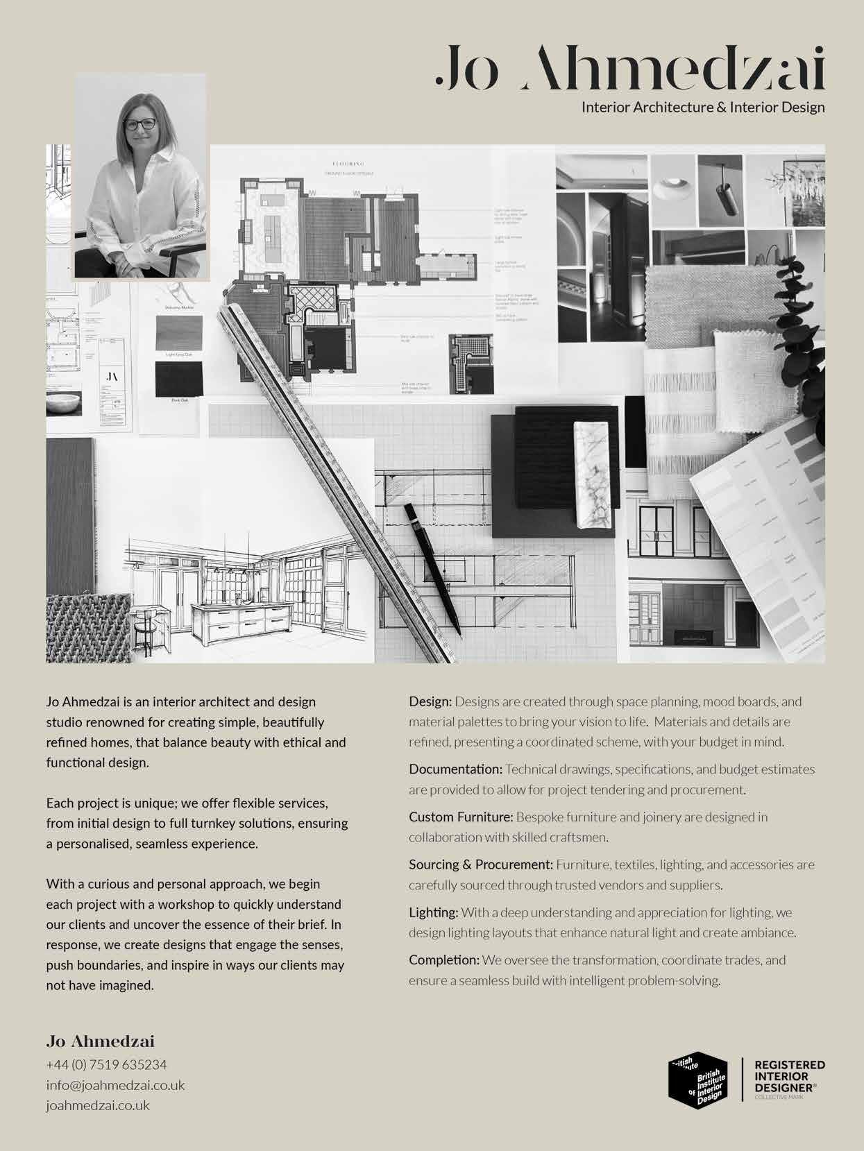 luxurious and deeply personal, reflecting each client’s lifestyle, values and aesthetic. Services range from online consultations for early-stage advice, to full-service design and project coordination. For larger-scale projects, Emily works closely with architects, builders, and craftspeople, overseeing every detail with discretion, clarity and a meticulous eye. Clients benefit from access to trade-only suppliers, custom joinery and hand-finished furnishings—alongside trusted guidance through planning, budgeting and procurement.