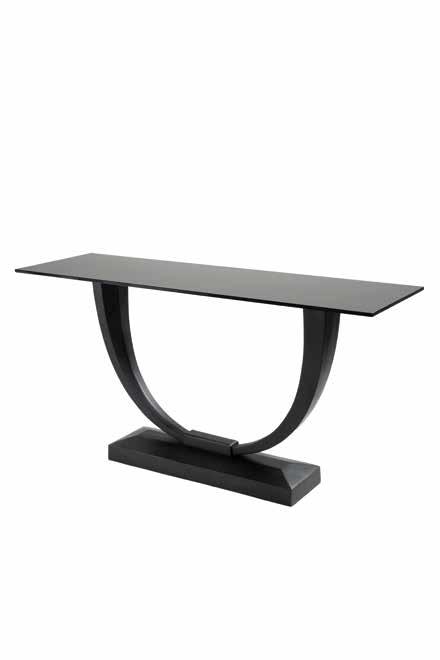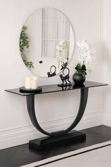 The OMNIA console table, also with black glass surface, features a hand-crafted aluminium base with a sleek matte black finish. This unusually shaped console table makes a striking focal point for hallways, bedrooms and living spaces. Priced at £599.99.