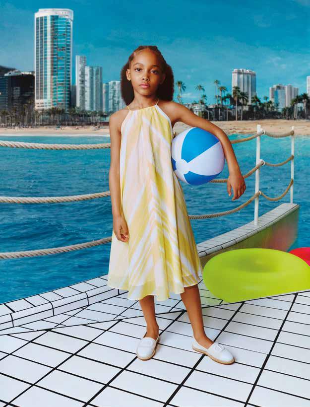 A dreamlike journey that unfolds through three idyllic ports of call. The first, Sweet Palazzo, is filled with the refreshing atmosphere of Florence’s palaces, offering an unprecedented invitation to venture away. Subtly echoing the art of the Renaissance, it unveils infinitely romantic creations: delicate floral motifs blossom on dresses and skirts in pastel shades while tops and jeans in washed denim add to the selection and, continuing the gentle, sunny interlude, jackets, T-shirts, and shirts are adorned with touches of blue or mint green, matched with models in cotton gabardine.