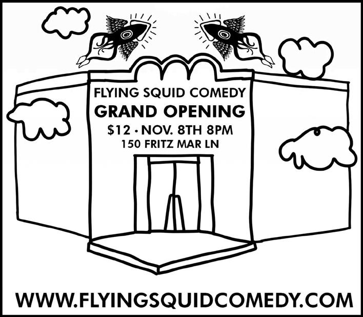 Support Flying Squid Comedy’s Kickstarter and join the fun at the Grand Opening on Nov 8 at 8 P.M. with special guest performances. Details at flying squidcomedy.com.