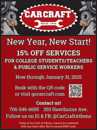 ATHENS ON ICE (440 Foundry Pavilion) Outdoor ice skating is currently available through February. Tickets include skate rental and 75 minutes on the ice. $15. www.classiccenter. com/iceskating ATHFEST MUSICIAN APPLICATIONS (Downtown Athens) The 2025 AthFest Music & Arts Festival, held June 20–22, is seeking applications from musicians to perform. Fill out the online form. Deadline Mar. 7. www.athfest.com/ athfest-musician-applications BIKE REPAIR STATIONS (Multiple Locations) Over 15 free bike repair stations are located across Athens with tools, an air pump and a QR code for quick guides on basic bike repairs. Visit the website for participating locations. www.accgov. com/10584/Bike-Repair-Stations COMMUNITY LAUNCHPAD PRO-