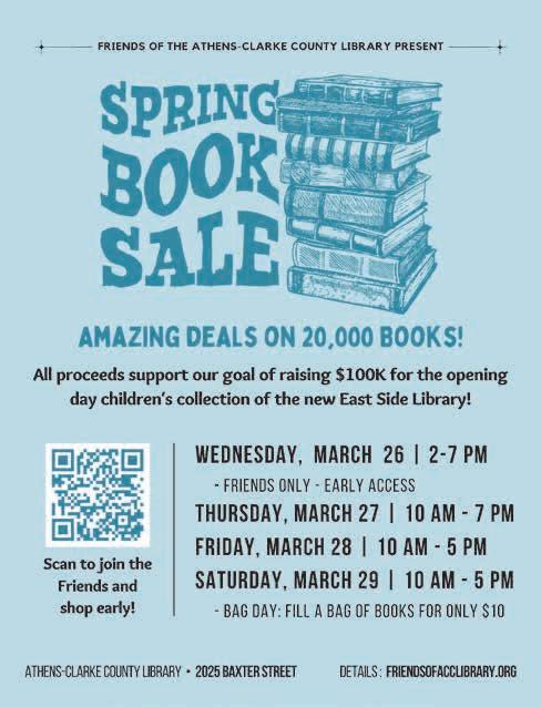 SEVENTH GENERATION (Various Locations) Seventh Generation Native American Church hosts gatherings on Sundays at 11 a.m. at Feel Free Yoga and Men’s Group on Tuesdays at 6 p.m at St. Gregory’s Church. For information: 706-3407134 SPRING REGISTRATION OPEN (ACC Leisure Services) A diverse selection of programs for both adults and children are now open for registration. Visit www.accgov. com/myrec to sign up. Scholarships available. www.accgov.com/ scholarship VHS DIGITIZATION (Athens, GA) Brad Staples (of the Athens GA Live Music crew) is seeking previously recorded concerts and events on VHS, VHSC, Hi8, MiniDV and DVDs to digitize and archive on YouTube channel, @vhsordie3030, and the Athens GA Live Music channel courtesy of Gregory Frederick. Materials will be returned, and credits and dates will be included. Contact for details and shipping info. bradley.staples88@gmail. com, vhsordie.com f