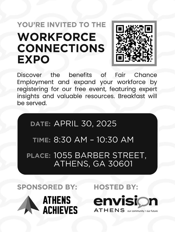 SEEKING COMMUNITY INPUT (Various Locations) The Athens-Clarke County Unified Government will host a series of public input events and survey opportunities as part of the Planning Department’s continued efforts to update Athens-Clarke County’s Future Land Use Map. List of events and drop-in meetings as well as a survey are available through Apr. 30. www.accgov.com/ compplan