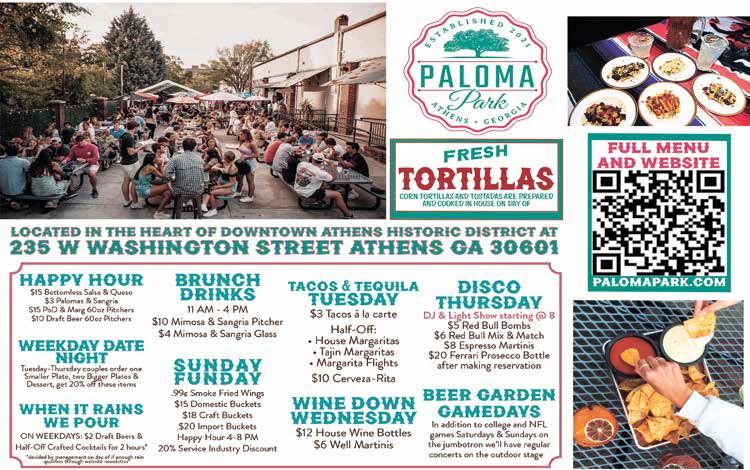 SKIP TOWN: Southeastern Stages (southeasternstages.com) intercity buses leave from 4020 Atlanta Highway, and competitor Megabus (us.megabus. com) also uses that station. Groome Transportation (groometransportation. com) will take you from one of several pick-up locations to Hartsfield-Jackson International Airport in Atlanta. Plans are in the works for a governmentfunded bus link between Athens and the Metro Atlanta Rapid Transit Authority station in Doraville as well. Athens is still searching for a commercial aviation carrier to fly into and out of our spiffy airport. Amtrak’s Crescent (amtrak.com) stops in Gainesville on its run between New Orleans and New York City. Athens may one day be a stop on a proposed high-speed rail line between Atlanta and Charlotte, but likely not for decades.