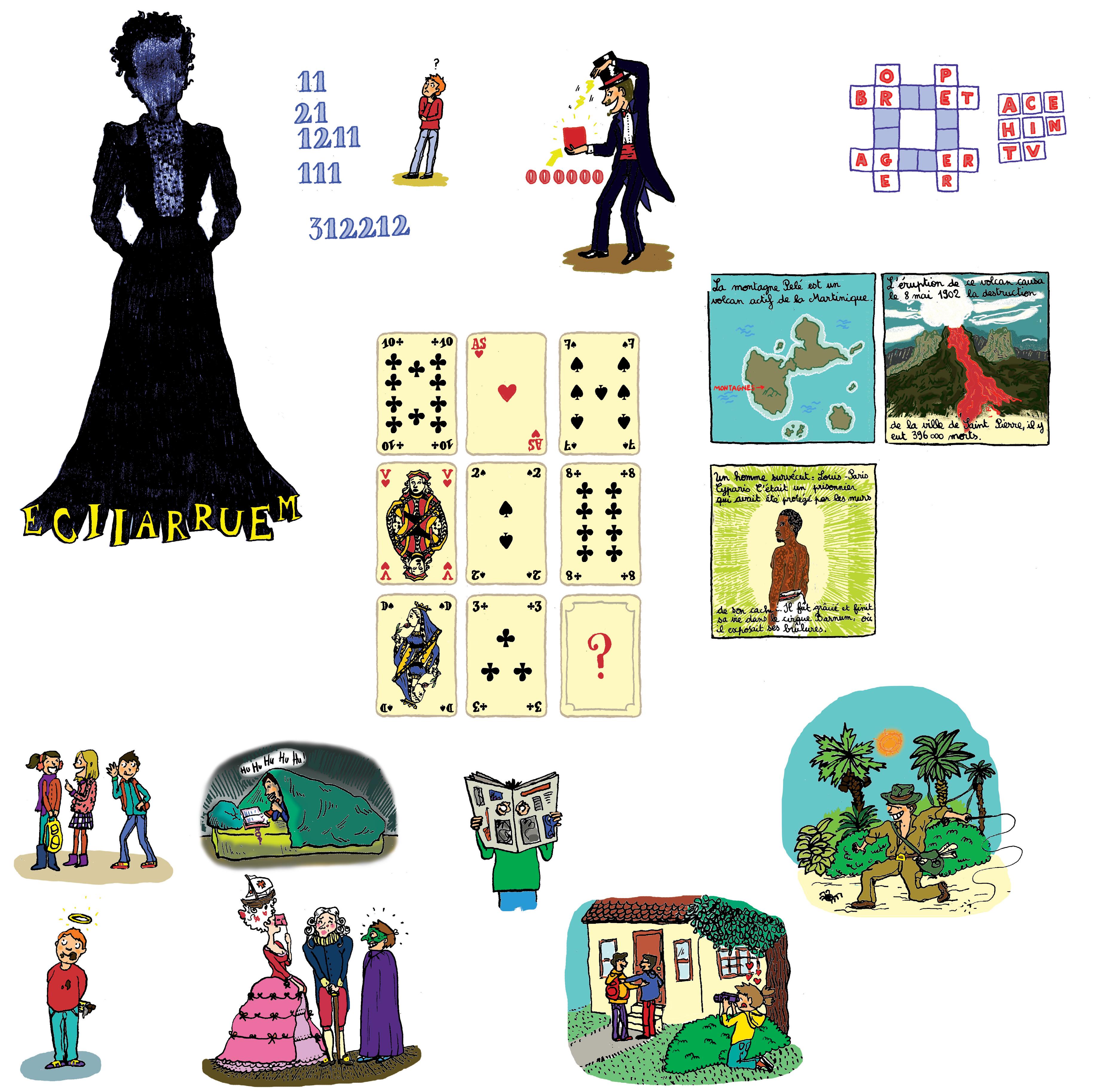 Pour le démasquer, lis ces indices : son voisin n’a pas les cheveux longs, il est entre deux imposteurs et est placé à côté de celui qui est assis. Où est-il ?