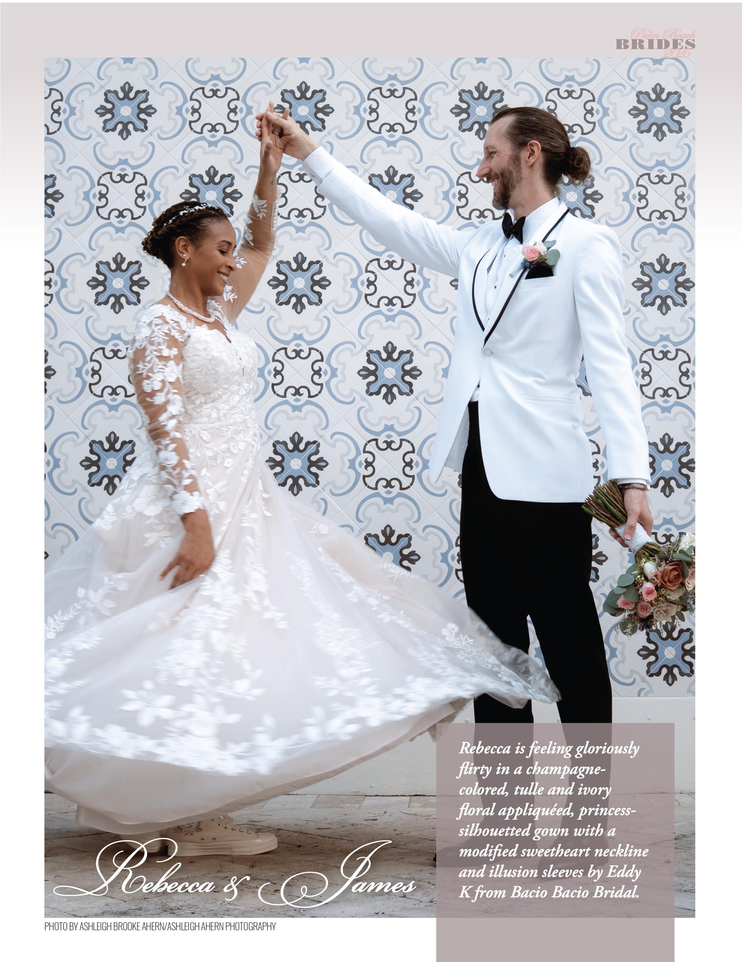 Sara is stunning in a silk charmeuse fit-and-flare gown from Justin Alexander, featur ing a ruched-scoop neckline and a chapel-length train. Olga, the “magical” bridal seamstress at Bacio Bacio Bridal, created her matching sleeves. Sara’s look is made complete with a mantilla veil designed by Boutique de Voile accessories.