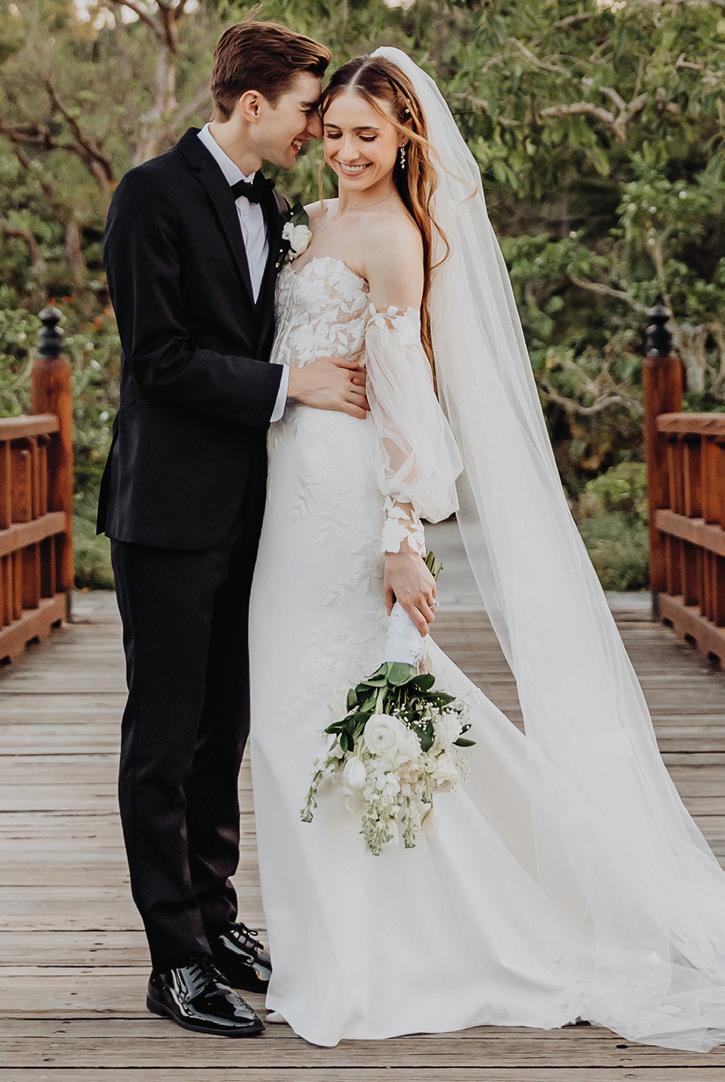 Kylie is wearing a strapless, corseted, stretch Mikado fit-and-flare gown by Elissar Bridal from Bacio Bacio Bridal. It features a sweetheart neckline and an illusion train. Off-the-shoulder bishop sleeves with matching floral embroidered appliqués and a veil with 3D appliqués give her a finished look.