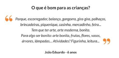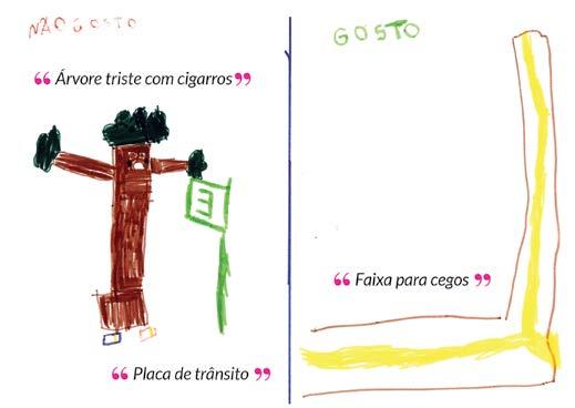 “Áreas floridas onde descansar, rios de águas limpas onde barcos transportam pessoas. Áreas verdes onde as crianças podem brincar, áreas de descanso, alimentos saudáveis, espaços públicos de qualidade, espaços bem ventilados, poucos carros, lugares que acolham animais, coretos para apresentação de artistas.” – Antônia, 7 anos, e Antonella, 8 anos