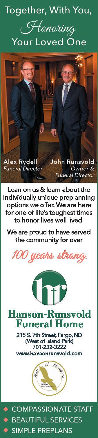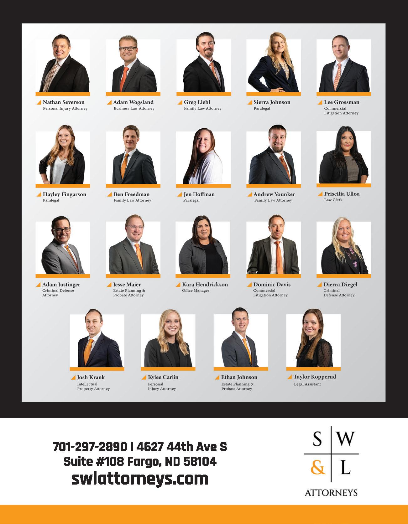 Fargo INC! is published by Spotlight LLC, Copyright 2022 Fargo INC! & FargoInc.com. All rights reserved. No parts of this magazine may be reproduced or distributed without written permission of Fargo INC!, and Spotlight LLC, is not responsible for, and expressly disclaims all liability for, damages of any kind arising out of use, reference to or reliance on such information. Spotlight LLC, accepts no liability for the accuracy of statements made by the advertisers. Spotlight, LLC 4609 33rd Ave S Suite #304 Fargo, ND 58104 or info@spotlightmediafargo.com ADVERTISING: 701-478-SPOT (7768) Graphic Designer Web Designer ADVERTISING VP of Business Development Sales Representatives Sales & Marketing Advisor Marketing Associate Client Relations Client Relations Manager Marketing Coordinator Operations Assistant DISTRIBUTION Delivery Ben Buchanan Kellan Benson Paul Hoefer Paul@SpotlightMediaFargo.com Al Anderson Al@SpotlightMediaFargo.com Devan Maki Devan@SpotlightMediaFargo.com Tori Helland Tori@SpotlightMediaFargo.com Kacey Mongeon Kacey@SpotlightMediaFargo.com Hailey Bebler Hailey@SpotlightMediaFargo.com ClientRelations@SpotlightMediaFargo.com Jenny Johnson Jessica Mullen Miranda Knudson John Stuber Fargo INC! is published 12 times a year and is available at area businesses and online at FargoInc.com. Publisher EDITORIAL Editorial Team Lead Editors Art Director Editorial Graphic Designers Creative Strategist Contributors INTERACTIVE Business Development Manager Business Development Associate Videographer Director of Digital Advertising Results Mike Dragosavich Brady Drake Brady@SpotlightMediaFargo.com Geneva Nodland, Grant Ayers Kim Cowles Levi Dinh, Ty Betts Josiah Kopp Shontarius D. Aikens, John Machacek, Ladyboss Lifestyle, Fredrikson & Byron Nick Schommer Kellen Feeney Tommy Uhlir Jonathan Chicka DECEMBER 2022 Volume 7 Issue 12