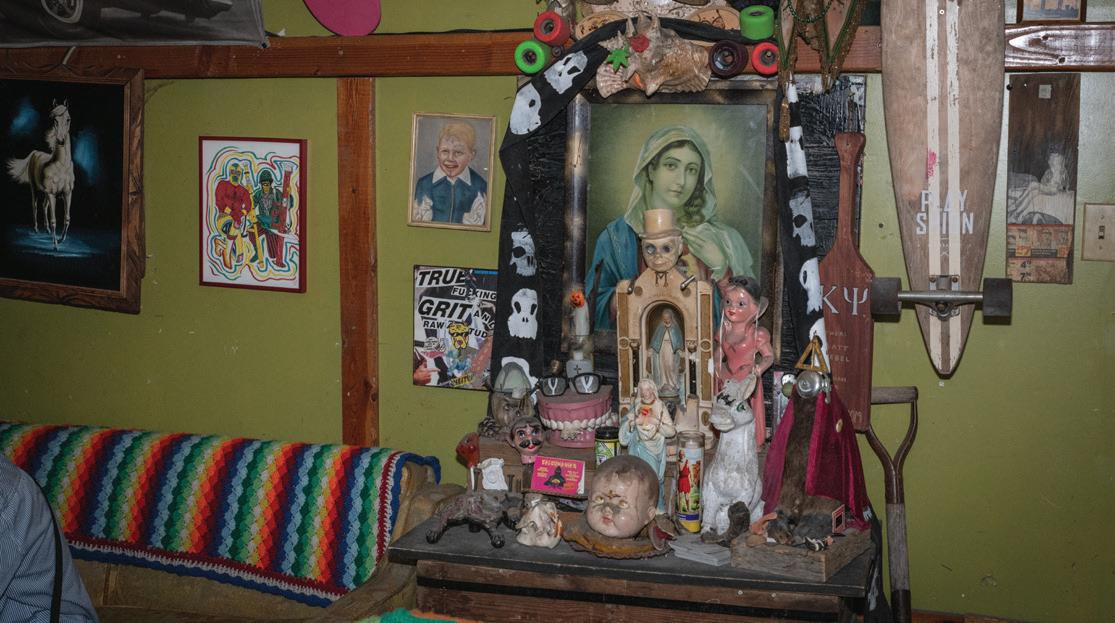 Punchgut is constantly experimenting with new techniques and materials. His pieces often come together over time—although there is no one length of time that he restricts himself to—with layers of glue, paint, and found objects to add depth and texture. His wall in his studio is one of the ways he determine's a projects finality.
