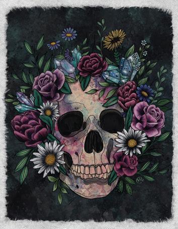Many of my art prints. I think, currently, my skull with the flowers or the raven are most popular. I have one print I like to call the holy three. It has books, cats, and plants. It’s very popular!