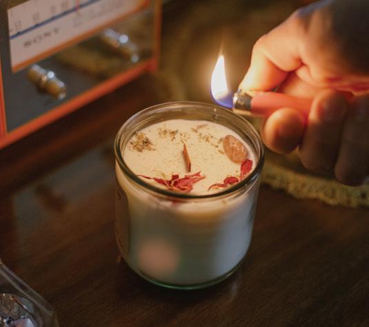 The couple behind Free Soul Candle Co. handcrafts soy candles decorated with dried florals and crystals. Their cleanburning creations, along with mists, diffusers, and massage candles, bring beauty, scent, and intention into the home. I grew up with wood wicker candles, so the sound and the smell make me feel right at home.