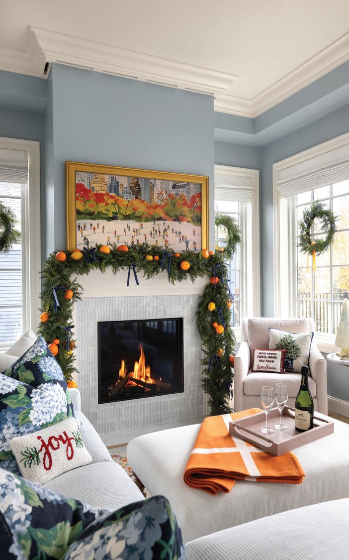 Christen has always been drawn to citrustype themes for the Christmas season, which she believes makes the space feel cheerful, fresh, and unexpected. The fireplace garland acts as the centerpiece of the room, overflowing with artificial lemons and oranges in all different sizes, shapes, and colors, offering lots of variation and character. "I love how it came together; it’s vibrant and full of energy," she said.