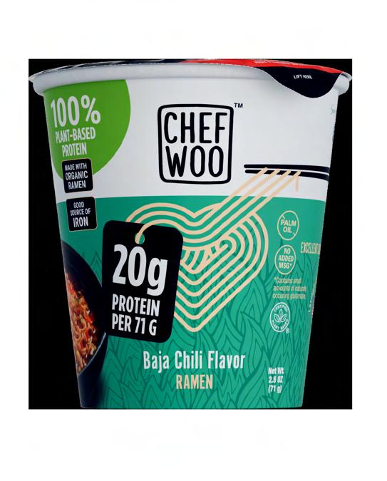 New Chef Woo Baja Chili is setting a new standard in the instant ramen category with its balance of bold flavor and functional nutrition. Proudly made in the USA, this plant-based cup delivers 20 grams of complete protein and essential nutrients in a smoky-sweet chili flavor inspired by Baja cuisine. As the first high-protein, plant-based instant ramen, Chef Woo bridges the gap between convenience and wellness, making it easier for operators and retailers to meet growing demand for betterfor-you options. With no animal products, no added MSG, and no harmful preservatives, it offers a cleaner label and broader appeal to healthconscious consumers. Crafted with simple, plant-based ingredients and supported by efficient U.S. manufacturing, Chef Woo Baja Chili reflects Borealis Foods’ mission to make nutritious, affordable food accessible on a larger scale. It’s a category innovation designed to drive growth across retail and foodservice channels.