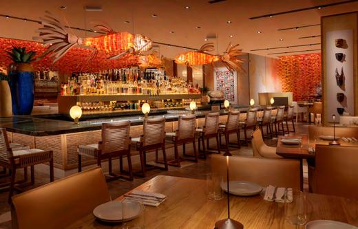 The artistry of the food pairs well with the vibrant, burnt oranges of a dining room that visually brings to mind a fiery beach sunset. Guests are greeted in dramatic fashion by a giant Olmec head sculpture in a corridor lined with large stone plinths and tropical foliage.