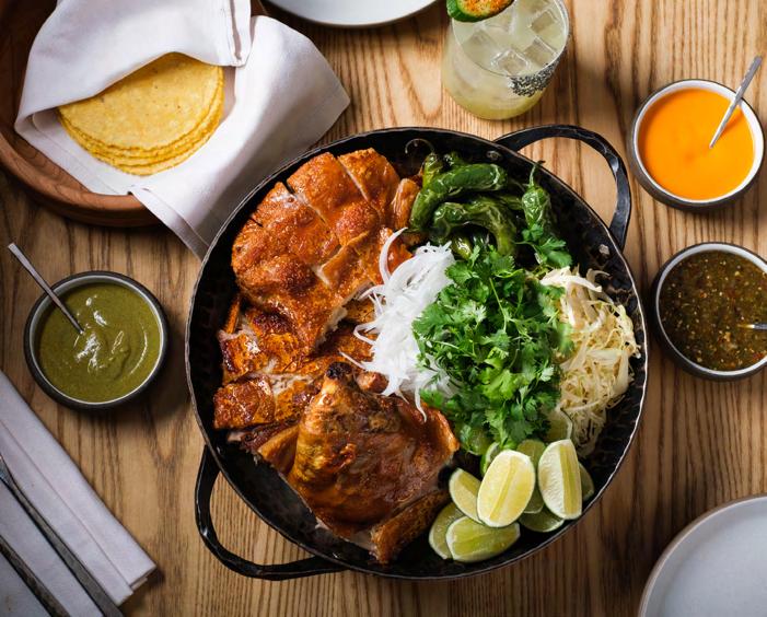 “We wanted to set the tone for our guests and encourage them to enjoy our menu with a group,” Thompson says. “Plates like the tableside salsa service and the whole roasted carnitas feel communal, reflecting a family-style experience that starts in our kitchen and (we hope) extends to every one of our guests. Other dishes, like our La Flama Blanca dessert, have dramatic presentations that feel interactive and memorable.”