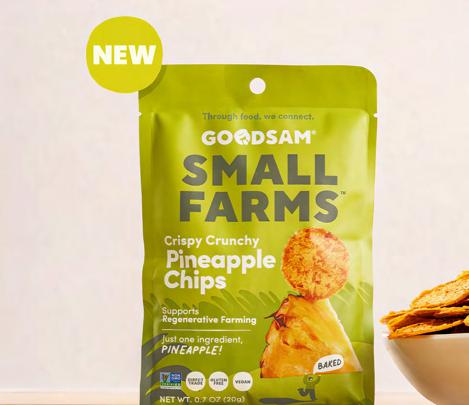 GoodSAM’s Crispy Crunchy Pineapple Chips are a slow-baked, single-ingredient snack made with premium pineapple, with no added sugar, oils, or preservatives. Each batch is carefully crafted to deliver a satisfying crunch, perfect on its own or as a topping for desserts, yogurt, or mocktails.These chips are NonGMO, vegan, and part of GoodSAM’s direct trade sourcing model, which works directly with farmers across multiple countries. Farmers set their prices and are supported in adopting regenerative, organic, and sustainable practices. GoodSAM’s pineapple is grown without chemical fertilizers or large-scale tilling machinery; instead, farms rely on composting and natural cycles that restore soil health and capture carbon. The company’s supply chain is 81% traceable end-to-end, covering everything from on-farm inputs to co-manufacturing and distribution. This traceability supports measurable progress in soil quality, pesticide reduction, and farmer income. Crispy Crunchy Pineapple Chips offers a clean, planet-friendly snack.