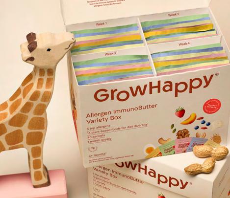 GrowHappy’s Allergen ImmunoButters™ are nutrient-packed spreads grounded in cutting-edge research that help families get allergens into their child’s diet easily and consistently. Research shows that early introduction of allergens in the first year of life, ideally as early as 4-6 months of age, and keeping them in the diet is an effective way to train the immune system while it is still developing. These plant-based ImmunoButters, sold in a monthly variety box consisting of 5 packs/each of individual key food allergens Peanut, Cashew, Walnut, Sesame and Egg, were created by leading pediatric allergists, researchers and a mom who bravely fed her daughter allergens Early & Often™. Designed for versatility, they can be mixed into breastmilk, formula, water, yogurt, oatmeal or a smoothie, spread on toast, on fruit or enjoyed straight from the packet with a spoon. A first-of-their-kind innovation, GrowHappy’s Allergen ImmunoButters and delicious, nutritious and foster happy gut microbiomes.
