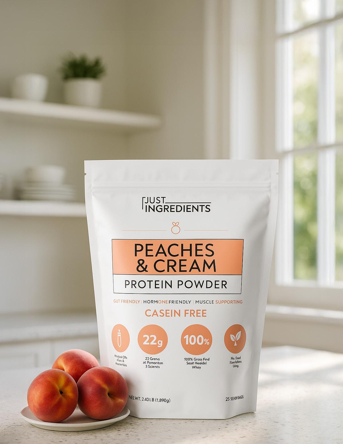Just Ingredients’ Peaches and Cream Protein Powder is a smooth, flavorful blend made with real ingredients- free from artificial sweeteners and sugar alcohols. Each serving delivers 22g of protein from a unique blend of four high-quality sources: 100% grass-fed whey protein from New Zealand, grass-fed collagen, organic pea protein, and organic chia seed protein. This blend provides a complete range of essential and non-essential amino acids, which play key roles in metabolism, tissue repair, and nutrient absorption- supporting overall health from the inside out. The naturally sweet flavor pairs ripe, juicy peaches and mangoes with creamy vanilla for a protein filled take on a classic favorite. Sweetened with monk fruit and free from gluten, as well as artificial and natural flavors, it’s made to nourish your body without the unnecessary additives. Whether you’re recovering post-workout or simply adding a nutritious boost to your daily routine, Peaches and Cream Protein Powder delivers effective, great-tasting nutrition you can feel good about. With premium ingredients and a crave-worthy flavor, it’s a delicious way to stay on track with your health goals.
