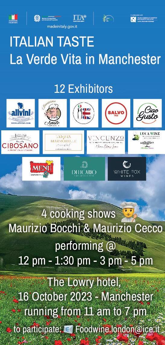 Proudly presented by ITA-Italian Trade Agency and the Italian Chamber of Commerce Italian Taste – La Verde Vita in Manchester is the latest trade event celebrating the Italian agrifood sector, showcasing Italian Products as examples of the value and quality of Italian agribusiness and their contribution to – and relationship with – sustainability Live from The Lowry Hotel (October 16, 2023 ,11am-7pm), it will be open to all food&wine and hospitality business operators wishing to discover the latest sector trends and Italian PDO/PGI products