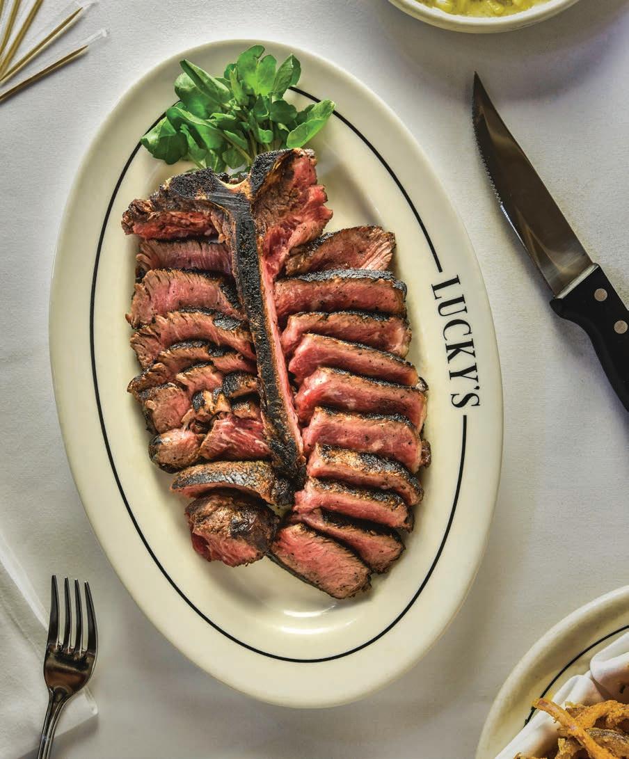 Lucky’s 28 ounce USDA Prime Porterhouse, served with Creamed Spinach, Creamed Corn and Skinny Onion Rings. www.luckyssteakhouse.com