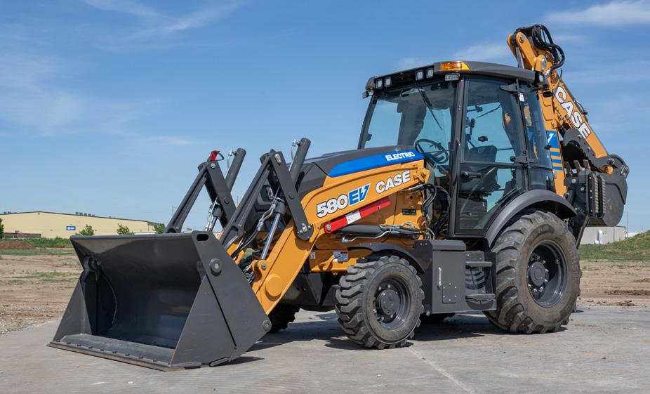 The new CASE 580EV electric backhoe loader carries over the same dimensional loading and digging specifications and delivers the same breakout forces as the four-wheeldrive, 97-hp CASE 580SN diesel model — marking an upgrade in performance since CASE first debuted its Project Zeus electric backhoe concept at CONEXPO in 2020. With this new production unit, CASE took customer feedback and made several updates from thermal management to operator controls to electrify a machine with comparable specs to the 580SN. CASE also included new features, like an 8-in. color display, air conditioning, a front-dash display and adjustable four-corner, multicolored LED strobe lights. Powered by a 400V, 71-kwh lithium-ion battery platform that’s charged with the same type of Level 2 J1772 adapter found in automotive EVs, the new electric backhoe loader is designed to deliver up to eight hours of operational runtime on a single charge, depending on the application. The battery platform also uses a thermal management system with system-specific cooling circuits to regulate temperatures and help maintain performance in hot or cold conditions. The four-wheel-drive 580EV uses two independent electric motors for the PowerDrive transmission and hydraulic pumps feeding the loader, backhoe and steering systems for performance in loading applications. The 14-ft. backhoe also includes an Extendahoe to boost reach, while features like ProControl swing dampening, PowerLift/PowerBoost and electrohydraulic controls support use on the jobsite. Electrification also provides performance features like torque response and peak torque at any rpm, so operators don’t need to wait for an internal combustion engine to ramp up to meet load demands. The cab has features like heating and air conditioning, an 8-in. touchscreen display, customizable work mode/sensitivity settings, push-button start and operator security codes. Multicolored, four-corner strobe lights also let operators work safely and meet regulatory requirements, with adjustable colors, strobe patterns and an “always-on” feature for low-light conditions when strobes are not needed.