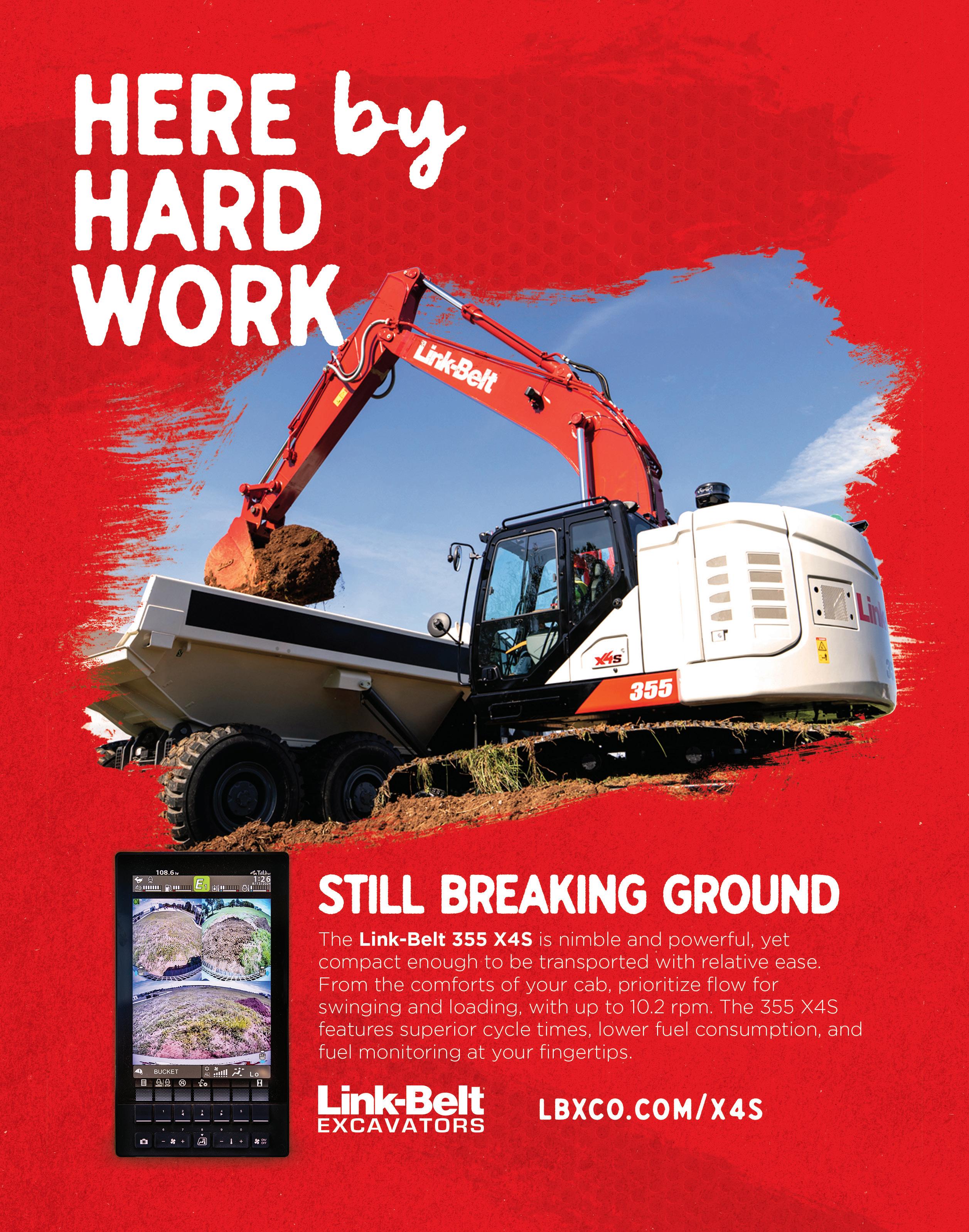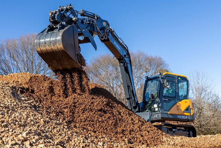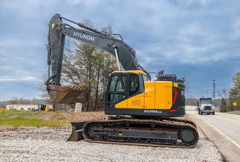 HD Hyundai Construction Equipment North America has announced the addition of the 258-net-hp (192 kW) HX355A LCR, a 35.5-ton compact-radius excavator, to its lineup of fullsized crawler excavators. With an operating weight between 78,483 and 79,807 lbs. (35,600 and 36,200 kg, respectively) HX355A LCR fits between the Hyundai HX350A and HX380A conventional-swing excavators. The compact-radius design allows the excavator to perform a multitude of jobs within confined areas typically reserved for smaller machines. The HX355A LCR is typically equipped with a 1-¾-yd3 (1.34 m3) bucket and features 18 in. (475 mm) of ground clearance. Hyundai also offers an 11-ft., 10-in. (3.6 m) dozer blade as an option. The HX355A LCR has four selectable power modes and one-touch power boost for control. The HX355A also comes with an integrated SPC (smart power control) system. SPC uses sensors and software to monitor the excavator’s workload in real time. Based on this data, it automatically adjusts engine power and hydraulic flow to match the required digging force.