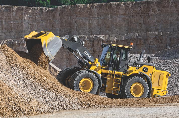 John Deere744 X-Tier and 824 X-Tier Wheel Loaders feature the John Deere Electric Variable Transmission (EVT) E-Drive system. Both models are equipped with a JD9 diesel engine as the primary power source, however, the torque converter and traditional transmission have been replaced by the EVT system. In addition, the E-Drive component provides instant power. Focusing on cab comfort, operators can expect a quiet cab environment attributed to the constant engine speed. Operators can also access seating and an AM/FM radio with Bluetooth capabilities. With the Advanced Vision System and Advanced Object Detection, operators can utilize a range of views on both sides of the loader and visibility beyond conventional mirrors. Also, dynamic reversal projected path lines assist with visualizing the anticipated reversal path for line of sight. The loaders are now equipped with John Deere Pile Slip Assist. Operators can experience proactive differential lock ahead of pile engagement which reduces tire slip, improves bucket fill and lowers cycle time.