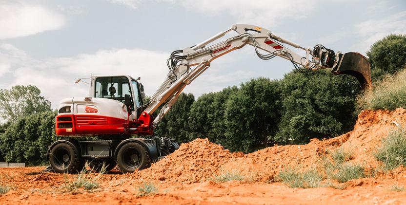 The TB395W excavator weighs 23,424 lbs. when equipped with outriggers and a blade. It’s powered by a Tier-4-Finalcompliant diesel engine delivering 114 hp at 2,200 rpm and up to 339 ft. lbs. of torque. A closed-loop, load-sensing hydraulic system delivers control of the work equipment and a range of hydraulic attachments. The TB395W features two steering modes -- 2WS (two-wheel steering) and 4WSC (four-wheel with crab steering). A two-piece boom with long arm allows for clearance between the bucket and dozer blade due to arm-mount position. This design allows TB395W operators to pull the bucket all the way back to the dozer blade, which is designed for working in narrow spaces or moving an obstacle out of the way. An Auto Cruise feature enables operators to set and adjust their travel speeds with a toggle switch. Auto Cruise is designed for using attachments that require a consistent, repeatable travel speed, such as a mulcher, mower or trencher. The excavator’s 13 ft., 5.2 in digging depth and 27-ft. cutting height makes it useful on construction sites. The TB395W offers a maximum bucket breakout force of 13,241 lbs., a maximum arm digging force of 8,925 lbs. and a traction force of 12,994 lbs. The TB395W is equipped with three auxiliary circuits that cater to different hydraulic requirements. The primary circuit delivers 32 gpm for use with hydraulic attachments. The secondary circuit provides 14.5 gpm, offering flexibility for a wide range of applications. Additionally, the third auxiliary circuit is specifically designed for use with a hydraulic quick coupler.
