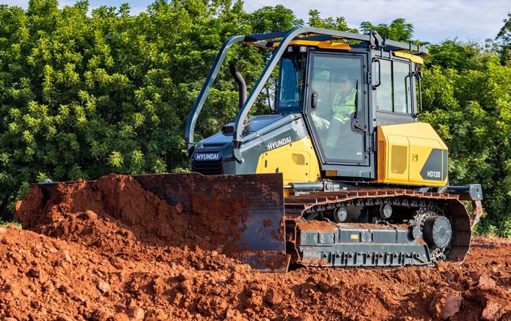 The HD130 dozer is a 15-ton-class machine equipped with a 4-cyl. Tier 4 Perkins 1204J engine. The HD130 can be ordered as either an LGP (low ground pressure) model or in an XL configuration. The LGP model has an operational weight of 33,730 lbs. (15,300 kg) and ground pressure of 4.98 psi (34.3 kPa), while the XL configuration weighs 31,907 lbs. (14,500 kg) with a ground pressure of 6.16 psi (42.2 kPa). Both feature a track length of 8 ft., 11 in. (2,720 mm). The HD130 comes standard with a 2D grading system that simplifies precision grading for novice operators. The system controls the blade functions, enabling faster and more accurate grading without the need for GPS or lasers. Standard electrohydraulic controls enhance ease of operation and accuracy, and the ergonomically designed joystick helps reduce operator fatigue. Blade movement, slope and tilt can be adjusted to three different levels of control via the monitor. Other key specifications include maximum travel speed of 5.6 mph (9.0 km/hr), eight lower track rollers, and shoe width of 30 in (760 mm) with LGP blade. The HD130 dozer comes Trimble-ready from the factory, so Trimble Machine Control can easily be installed, offering enhanced precision and guidance for complex designs and construction projects. This feature allows for more accurate and efficient operation in challenging work environments.