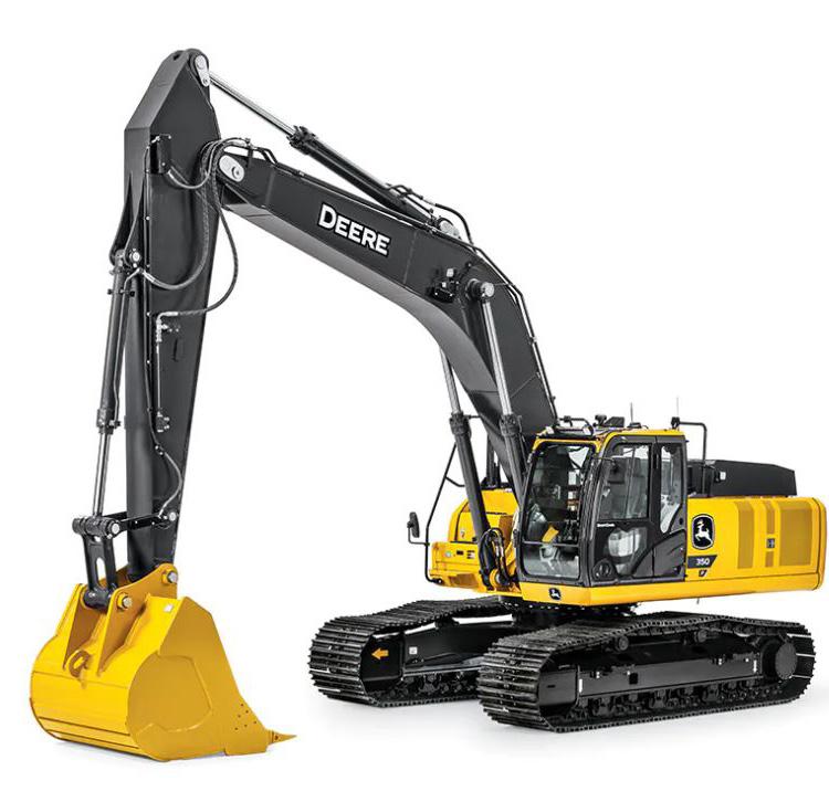 John Deere offers the updated 350 P-tier excavator, manufactured in Kernersville, North Carolina. The excavator offers SmartGrade technology as a factory option and field upgrade kits. Customers can choose from 2D guidance, 3D guidance, 2D SmartGrade Ready Control, and SmartGrade 3D Control. These grade management options allow customers to choose a level of technology that’s right for them with the ability to upgrade as their business grows. Overdig protect limits the bucket’s cutting edge from going below the target design surface. Visibility around the machines has been improved with the option of a right, rear and left camera system with LED surround lighting that provides 270-degree visibility and is integrated into the primary display in the cab. This model comes standard with front LED work lights. Owners and operators also have the option of a heated air suspension seat, leather heated and cooled seat, additional deluxe LED work lights, as well as cold weather and debris packages for those who tackle jobs in any weather condition. Outside the cab, the machine is equipped with a new, larger hood design and better serviceability. Each cooler is individually removable, and operators or technicians have access within the compartment. The excavator features electric on-demand cooling fans that reduce engine load, in-line after treatment for less restriction and system complexity, along with increased front piping diameter to cut down hydraulic restriction.
