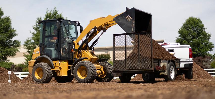The Cat 903 compact wheel loader is designed to make work easier with its Cat C1.7 engine, offering 17% more horsepower than the previous model. The increase in power delivers improved performance when pushing, operating on grades, and using drive, steer and lift functions simultaneously. It provides a higher full turn tip load rating of 5,516 lbs. (2552 kg). Designed to provide comfort, the operator’s workstation features legroom, ergonomic pedal positioning, easy entry and exit, and optional speed-sensitive ride control. The multifunction joystick provides fingertip control of the standard third-function hydraulic system. Minimal engine overhang results in excellent rear and corner visibility, allowing for efficient operation in confined areas. Providing improved comfort, the seat design includes yellow touch points, making it easier to find the preferred operating position. The 903 can be optionally equipped with a hydraulic skid steer loader (SSL) coupler for faster and more efficient work tool changes. It provides a viewing window that enables the operator to see the fork tips when using available compact wheel loader style forks. The auxiliary hydraulic system delivers higher than previous flow of up to 14.5 gal./min. (54.9 l/min) at 3,336 psi (230 bar) for increased hydraulic power to operate hydraulic work tools likes power box rakes and grapple.