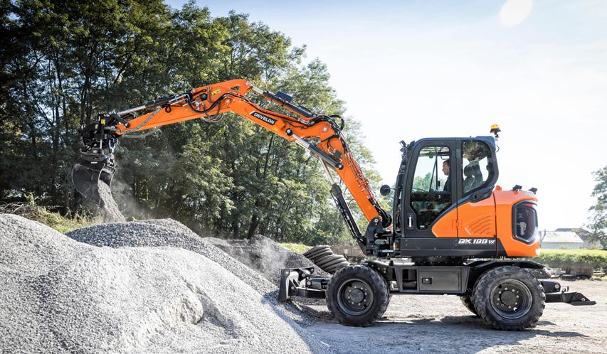 The DX100W-7 mini wheel excavator is capable of reaching speeds up to 24 mph and features a roomy cab, with low noise and vibration levels paired with high visibility. The machine comes equipped with three steering modes including four-wheel crab, which is designed to offer precision and maneuverability in tight spaces without the need to reposition the entire machine. The reinforced articulated boom features an additional pivot point. The DX100W-7 has a 1.35-ton counterweight for digging and lifting performance. It also features a large hydraulic capacity, so it can hoist and maneuver heavy loads. The excavator has a standard hydrostatic system that uses hydraulic fluid for responsive operation and control. By transferring power directly from the engine to the excavator wheels, the system provides high torque even at low speeds. Also standard is the around view monitor (AVM) camera system with a 270-degree view, equipped with ultrasonic sensors. The sensors alert operators of nearby objects as they back up the machine. A standard overload warning device is another safety feature and protects the machine against wear and tear.
