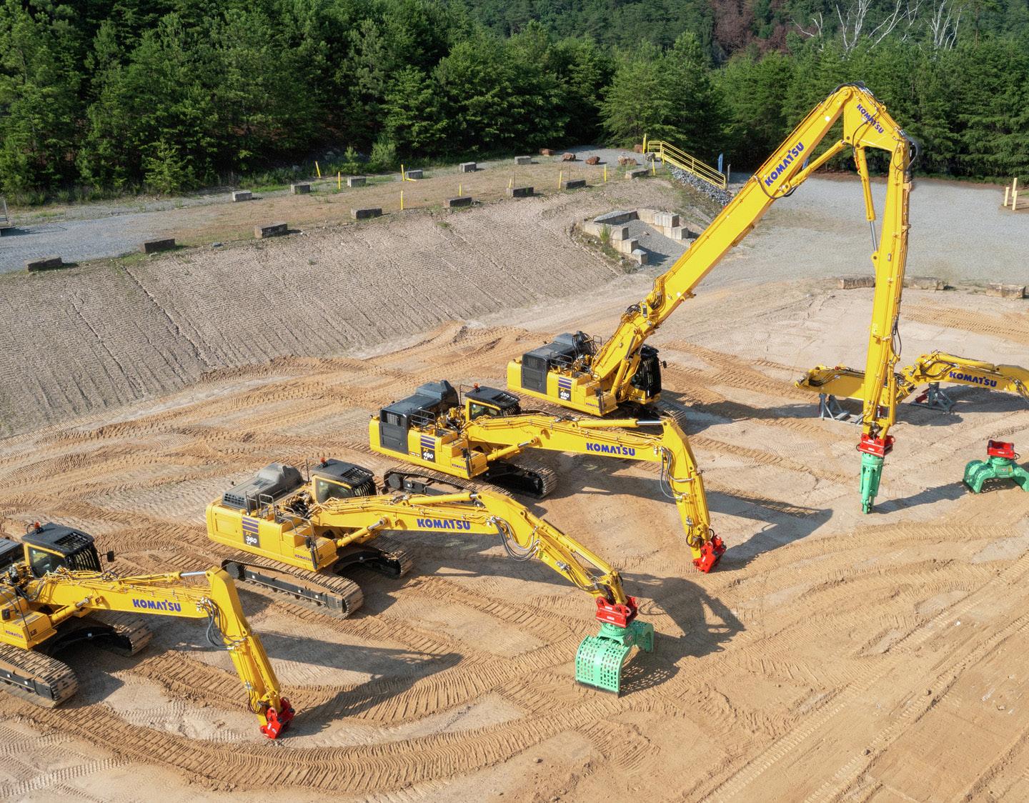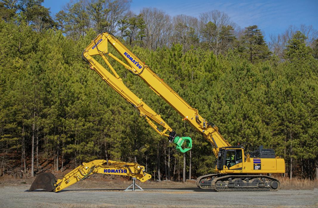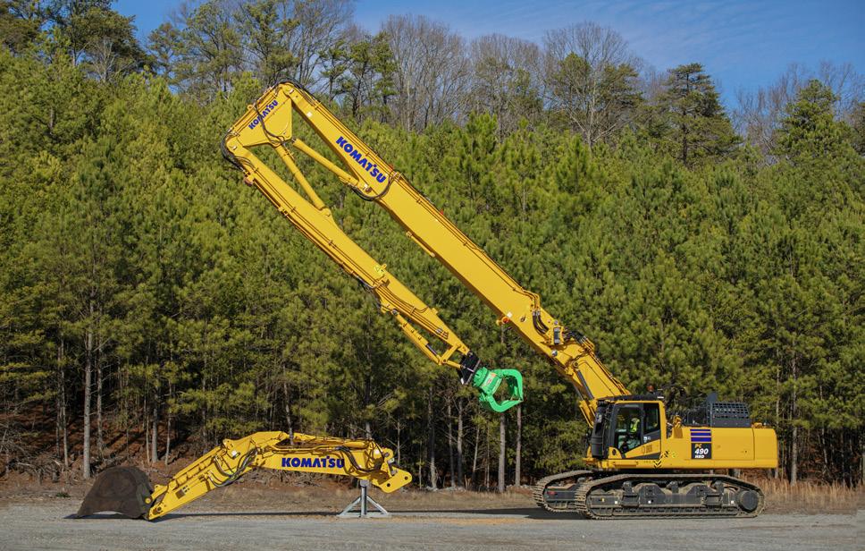 The PC490HRD-11 demolition excavator features the K100 boom change system. The machine can reach up to 104 ft. and includes a full demolition guarding package, visibility from a 45-degree tilting cab and an informative human/ machine interface panel. The PC290LC-11, PC360LC-11 and PC490LC-11 straight boom excavators enable reach with customization that allows users to program up to 15 different tools. The machines are built to tackle tough demolition jobs with protection elements like heavy-duty revolving frame and under guards, bucket cylinder guard, boom light protection guards and reinforced attachment linkage. Komatsu’s product line of Lehnhoff quick couplers and Montabert demolition attachments can be paired with these demolition excavators.