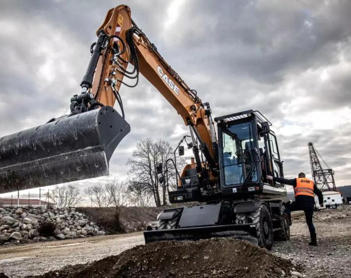 The CASE WX210E Wheeled Excavator caters to large-scale construction projects in outdoor worksites. Powered by a Cummins B6.7 6-cyl. engine, the 170-hp excavator features three preset power modes. The WX210E offers an operating weight of 53,649 lbs. A standard two-piece boom enables operation close to the excavator. An optional monoboom with 32 ft., 9 in. of maximum reach is available. This machine delivers a maximum swing speed of 10.9 rpm during use. Joystick steering and control allows the excavator to travel up to 24 mph on high travel speed and 5.9 mph at low travel speed. A creep speed of 1.9 mph can be set for stable movement on the jobsite. The machine is equipped with an 82-gal. fuel tank. Individuals can access an 8-in. touchscreen display inside the cab to access controls and settings, as well as a separate camera display.