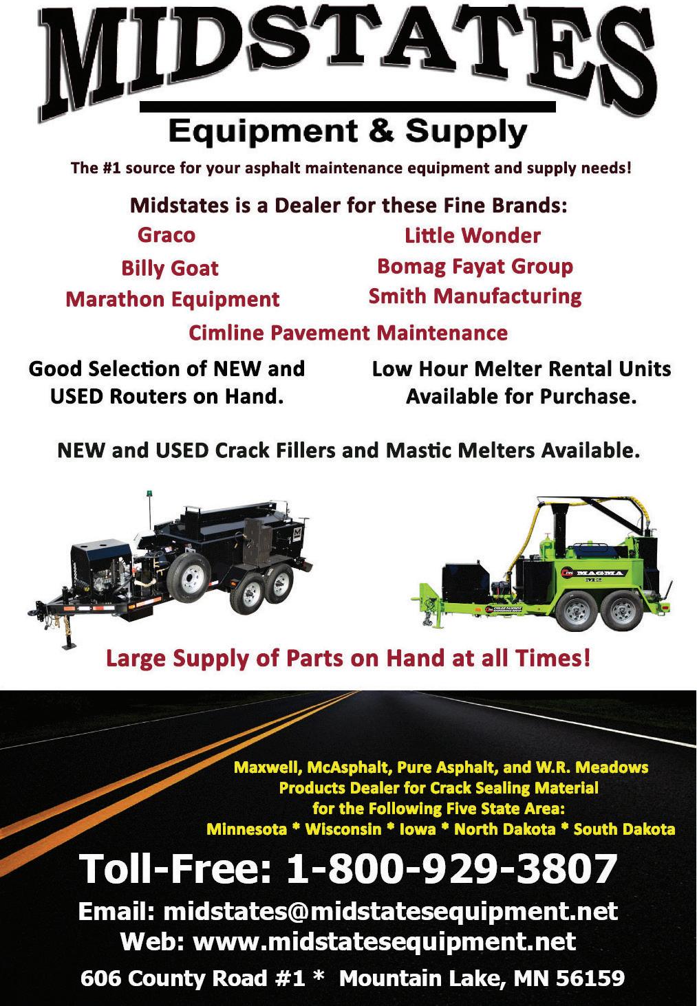 Subscription policy: Individual subscriptions are available without charge in the U.S. only to pavement maintenance contractors, producers and government employees involved in paving or pavement maintenance; dealers, and distributors of pavement maintenance equipment or materials; and others with similar business activities. Complete the subscription form at www.forconstructionpros.com or use your company letterhead giving all the information requested. Publisher reserves the right to reject nonqualified subscribers. One year subscriptions for nonqualified individuals: $35.00 U.S.A., $60.00 Canada and Mexico, and $85.00 all other countries (payable in U.S. funds, drawn on U.S. bank). Single copies available (prepaid only) $10.00 each (U.S., Canada & Mexico), $15.00 each (International). Pavement Maintenance & Reconstruction (ISSN 1098-5875), is published eight times per year: January, February, March, April/May, June/July, August/September, October/ November, December by IRONMARKETS, 201 N. Main St. Ste 350, Fort Atkinson, WI 53538. Periodicals postage paid at Fort Atkinson, WI and additional entry offices.